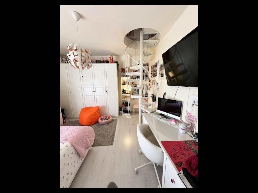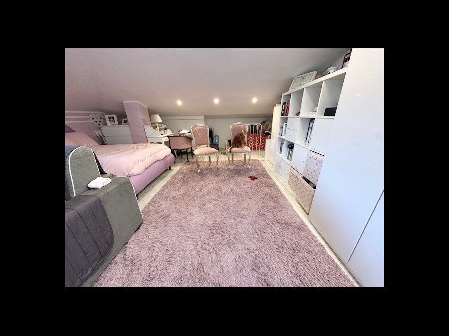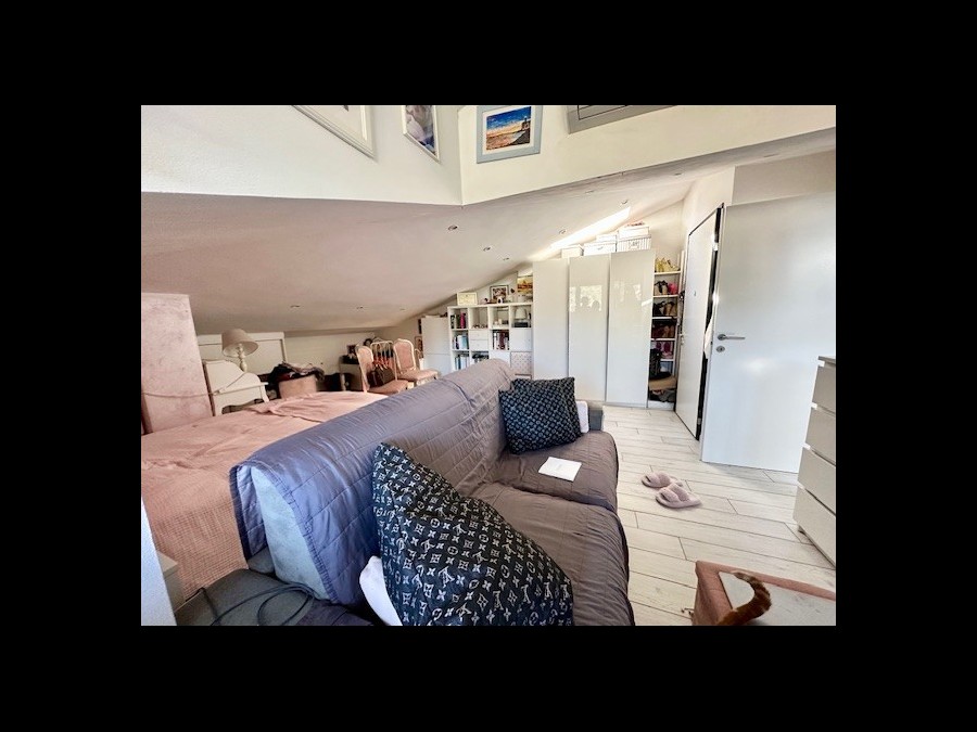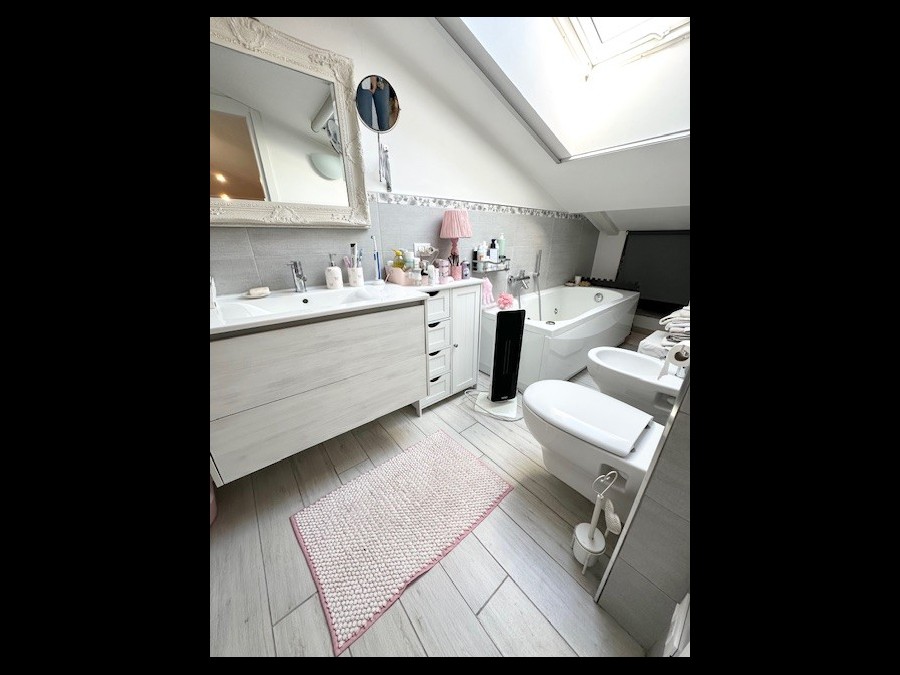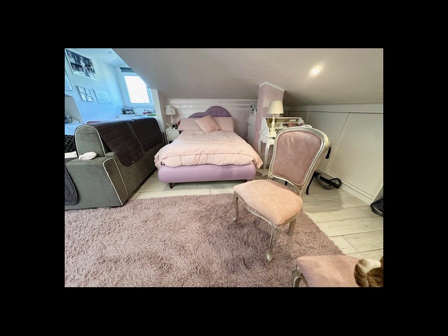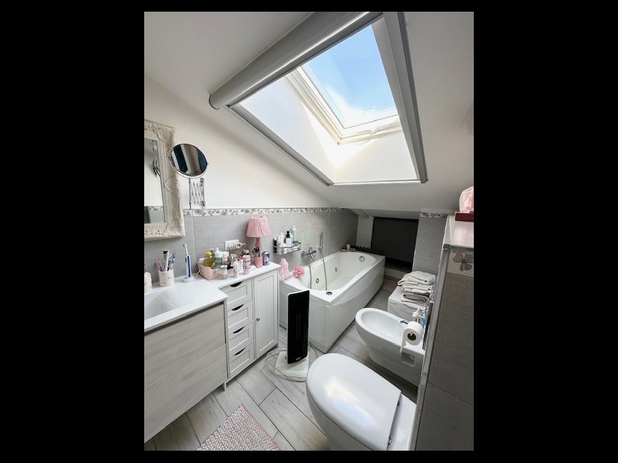 Il piano superiore mansardato è un ambiente unico grande composto da una cucina a vista una zona living, camera e bagno grande con vasca idromassaggio si accede sia dalla scala interna che dal vano condominiale creando all'occorrenza un ambiente completamente indipendente all'appartamento.
